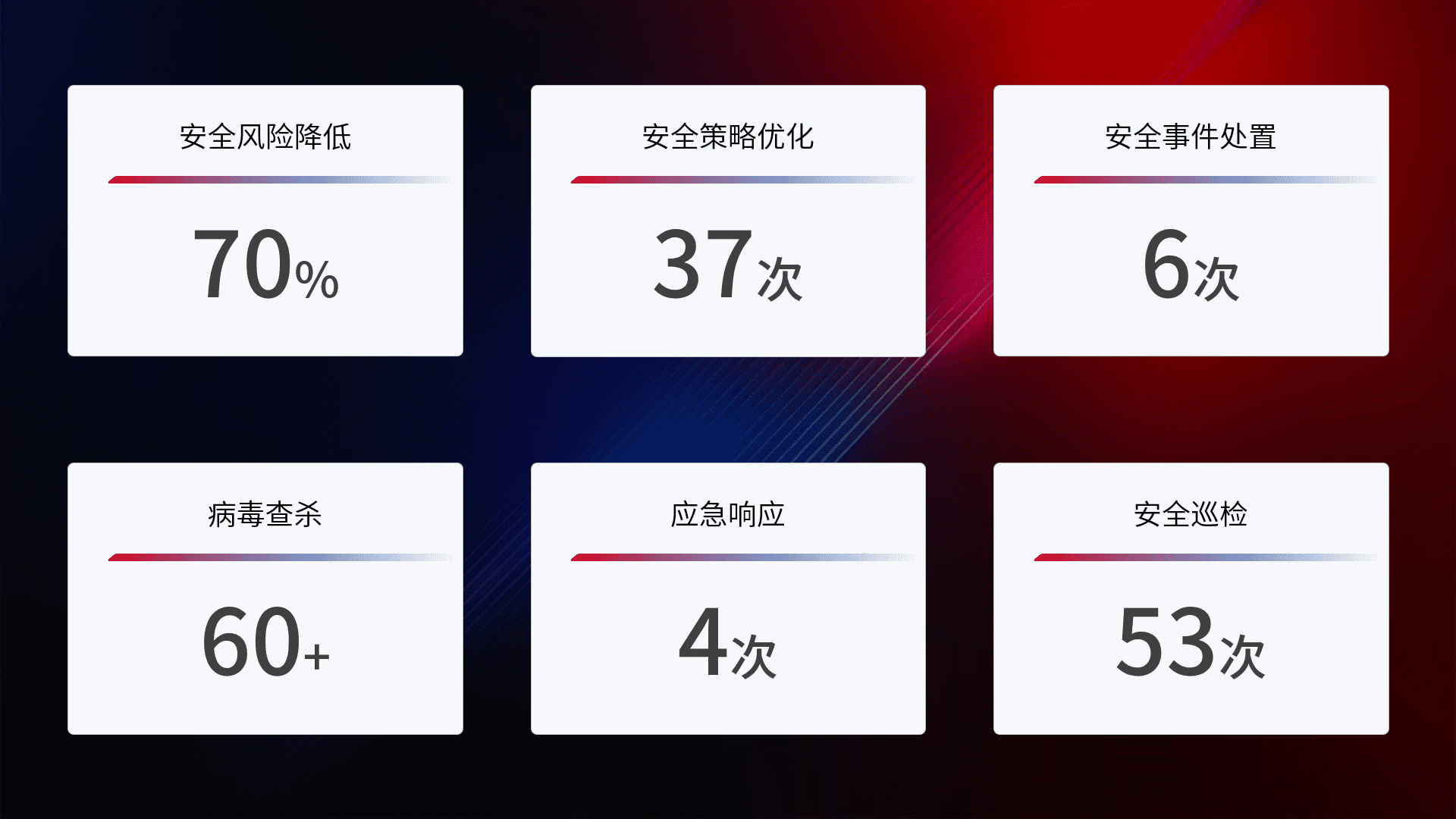 提供全面的安全事件报告体系,,,,包括处置报告、、、周报、、、、季度和年度总结,,,结合持续监控,,,,帮助客户深入了解网络安全状况。。。。