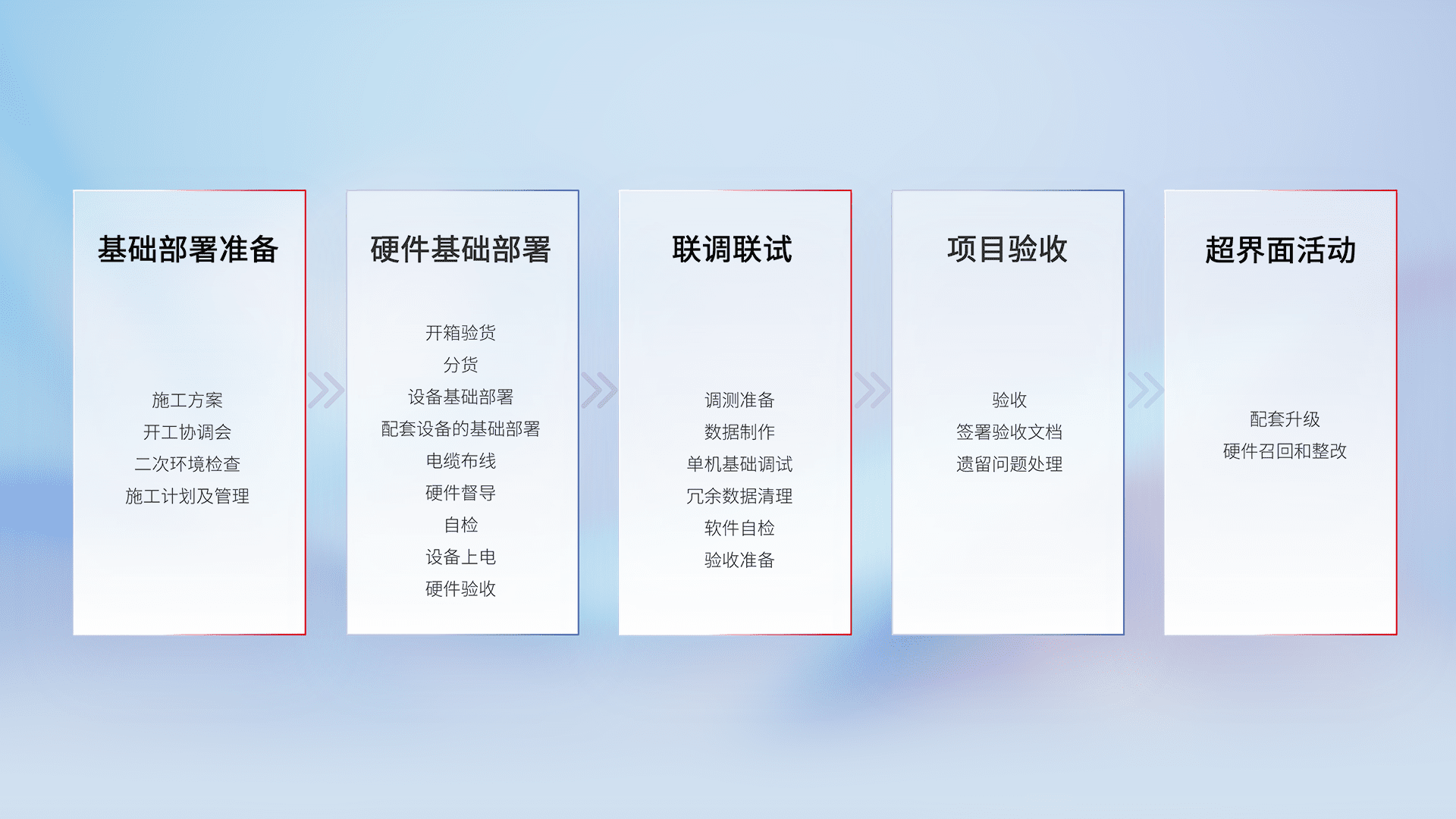 从基础部署准备、、硬件基础部署、、联调联试、、、项目验收、、、、越界面活动的全过程可追溯,,,,保证施工质量和进度。。。。